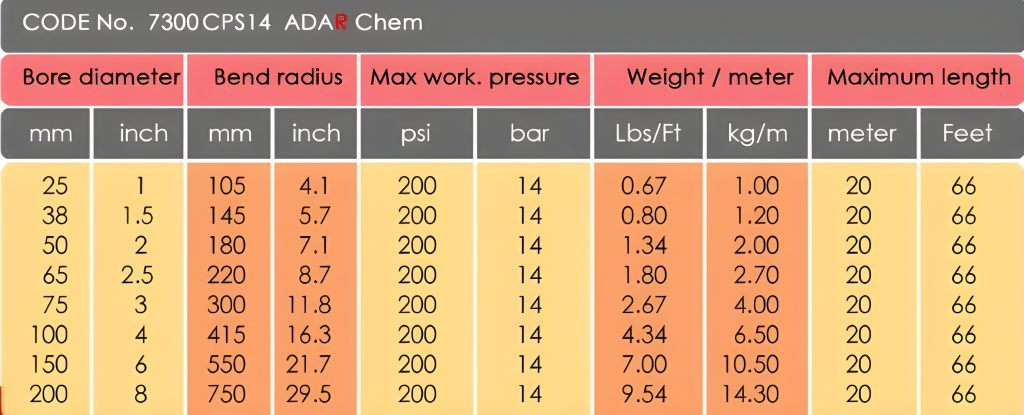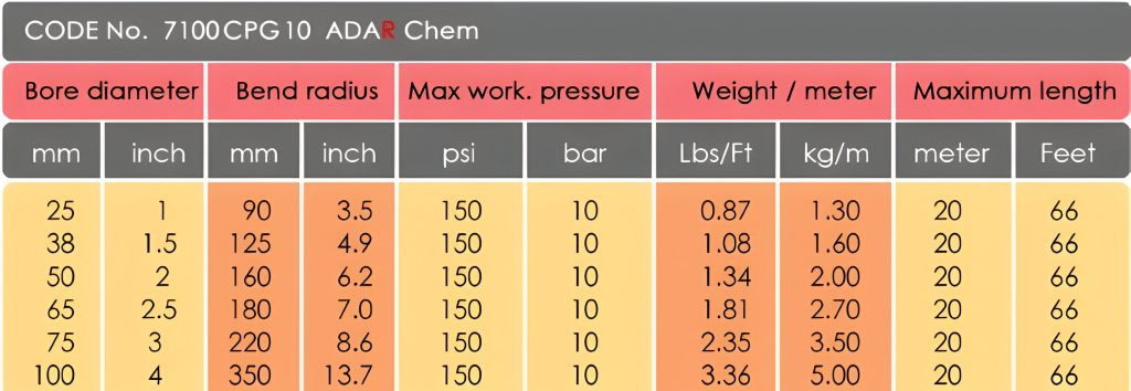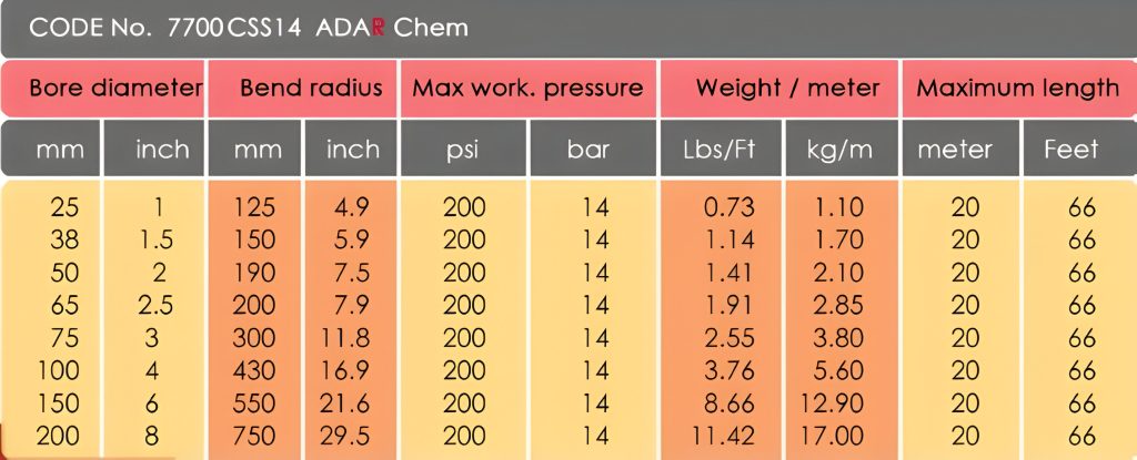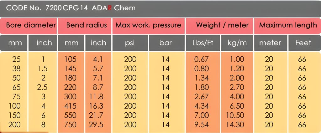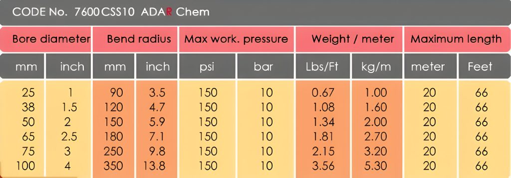 Chemical hoses are lightweight and flexibility are essentially designed for chemical utility hose for chemical plants, refineries, paint producers,paper mills and many other-in-plant,liqiuid tranfer operations,also rail car loading and tank truck loading and delivery,stroage tank transfer,refinery process and can handle highly corrosive acids, alkalies,aldehydes,aminies,aliphatic,aromatic fuels,chlorinated hydrocarbins, alcohol's, esters, ketones, lacquers and pertoleum products at rated discharge pressure orat full suction. 4:1 safety Factor, ISO Approved.