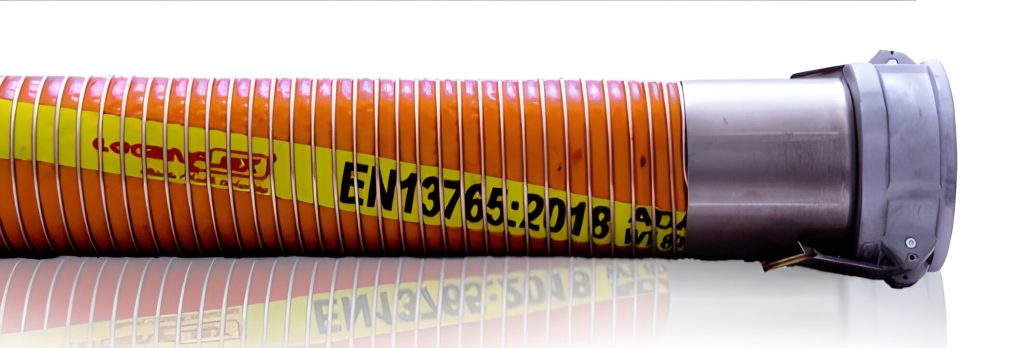 Composite hose has a spiral internal and external metal supporting wire which can be galvanized steel, stainless steel or polypropylene coated steel. In between the wires there are polypropylene fabrics and films with an abrasion resistant PVC coated fabric cover. The hose contains a barrier layer for 100% aromatic hydrocarbons