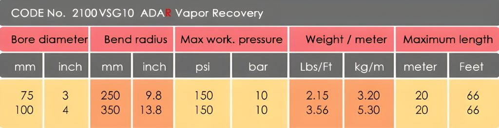 Vapor Recovery hoses are designed the recovery of volatile hydrocarbon vapors in rail car and truck loading terminals, and unloading at service stations. Designed for compliance with EPA stage-1 requirements for recovering volatile hydrocarbon vapors in rail car or tank truck loading at bulk terminals,and unloading at service stations.Designed to meet the demands for light weight, flexiility and strenght imposed on these hoses in the marine environment in vapor recovery operations.