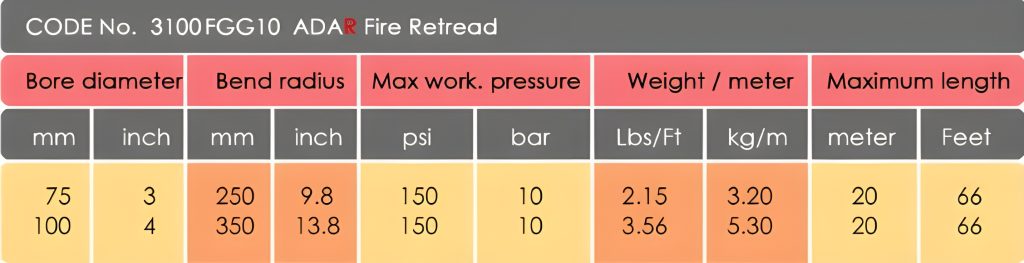 Fire Retread hoses are designed for a wide range of fuel, oil and lubricant applications where lightweight and flexbility are essential, i.e rail car and tank truck loading and delivery, storage tank transfer, refinery process, drumming, manifloding batching, and blending. 4:1 Safety Factor, ISO Approved