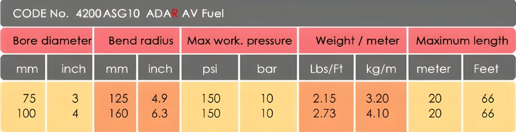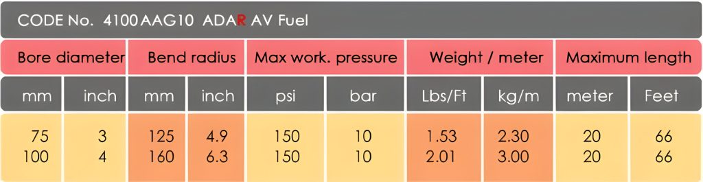 Aviation Fuel Light hoses are designed for the weight of the hose is critical, however the crush resistance is not as good as for AV Fuel For use in the aviation industry for the conveyance of aviation fuels.4:1 Safety Factor ISO Approved